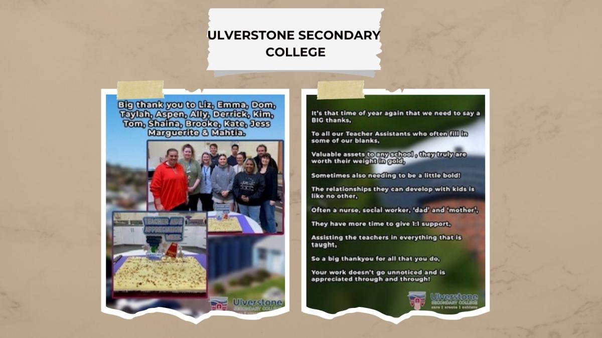 Steph Knowles, AST/ Support Teacher, wrote a poem to celebrate the fabulous Teacher Assistants at Ulverstone Secondary College. It looks like there was cake too :)