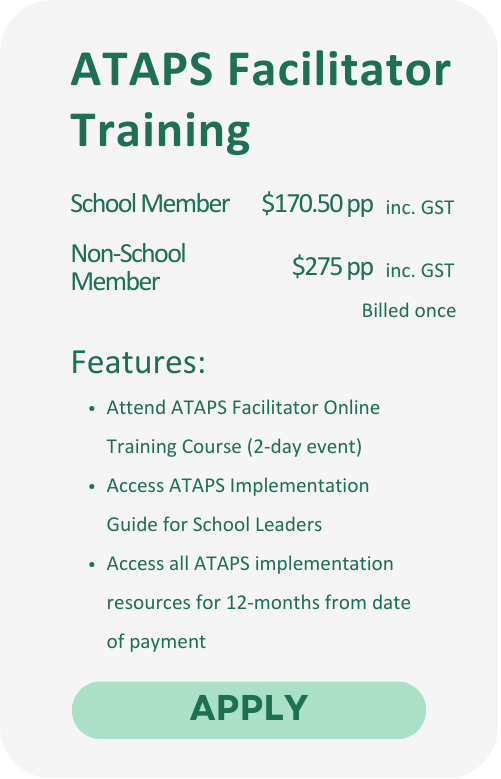 On completion of the training, schools can elect to become an accredited ATAPS Partner School™ and display the ATAPS Partner School™ badge on their website. Accreditation is conditional on meeting course requirements, and details will be provided upon membership.