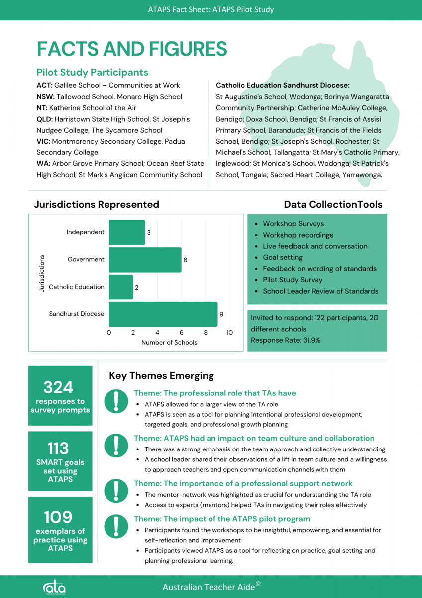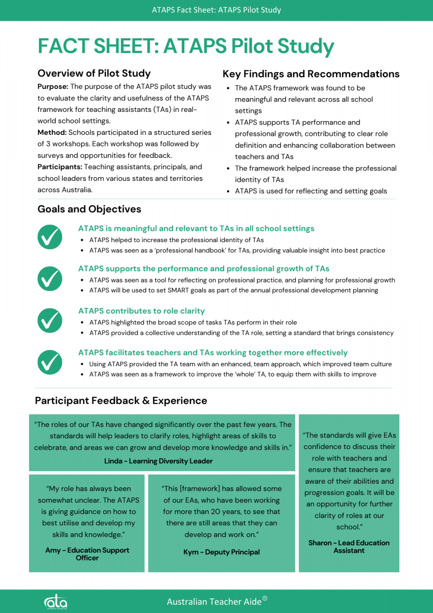 ATAPS was funded by Australian Teacher Aide, to benefit the education support sector. Stella Liliendal, Director and Co-Founder, led the development with support from other members of the Australian Teacher Aide team, and a panel of education experts from State, Catholic and Independent schools, as well educators from the university and vocational education sectors.