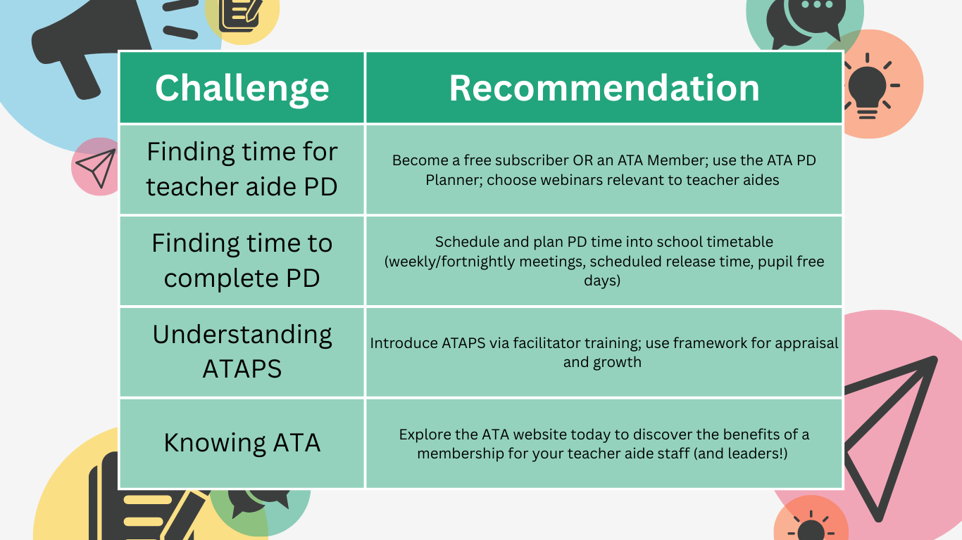 Take a moment to consider the barriers stopping you from providing professional learning for TAs at your school. Consider exploring what ATA has to offer to enhance and support your TAs today!