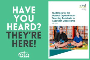 On a separate note, we welcome the much-awaited publication of AITSL’s new Guidelines for the Optimal Deployment of Teaching Assistants in Australian Classrooms, which highlight the important role of professional associations like Australian Teacher Aide in supporting schools. We were honoured to have a consultative role in the development of these guidelines, and through our professional learning and the Australian Teaching Assistant Professional Standards (ATAPS) framework and resources, we are excited to offer a practical solution to meeting the 7 recommendations outlined for school leaders.